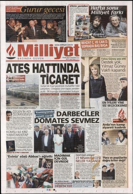 «Εμπόριο κάτω από τις μάχες» είναι ο τίτλος της Milliyet. Η τουρκική εφημερίδα αναφέρει πως το τελωνείο Τζιλβέγκιοζου το οποίο βρίσκεται στα σύνορα Τουρκίας-Συρίας άνοιξε ξανά, και εκατοντάδες νταλίκες περιμένουν στην ουρά για να μπουν στη Συρία και να μεταφέρουν εμπορεύματα.
