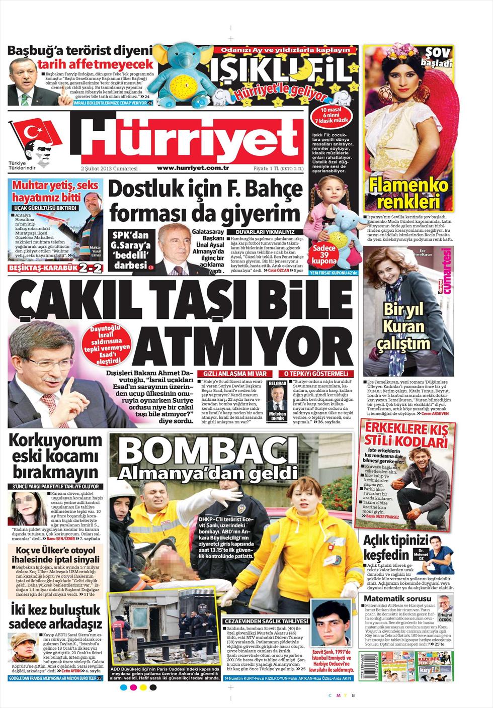 «Δεν τους πετά ούτε χαλίκια» είναι ο τίτλος της Hürriyet. H τουρκική εφημερίδα αναφέρεται σε δηλώσεις του Νταβούτογλου ο οποίος φέρεται να αναρωτιέται τους λόγους που η αεράμυνα της Συρίας δεν απάντησε στις επιθέσεις του Ισραήλ. « δεν καταλαβαίνω γιατί δεν αντέδρασαν δεν τους πέταξαν ούτε χαλίκια!» φέρεται να δηλώνει ο Νταβούτογλου.