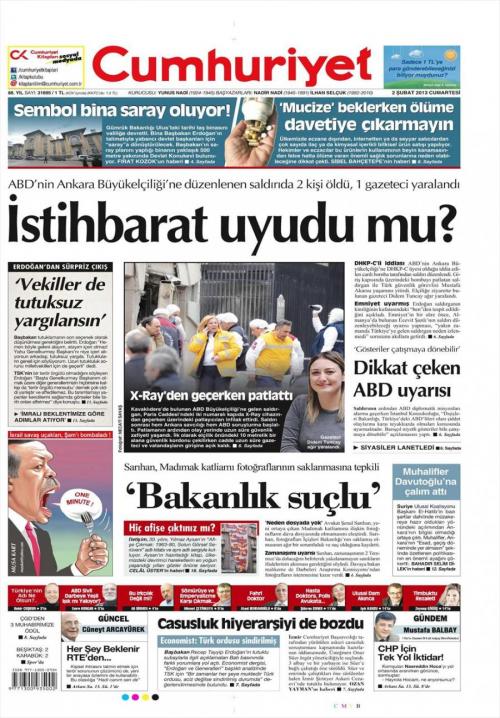 «Κοιμήθηκαν οι υπηρεσίες πληροφοριών;» είναι ο τίτλος της Cumhuriyet. H τουρκική εφημερίδα τονίζει πως οι τουρκική αστυνομία είχε προειδοποιήσει πως ο καμικάζι που πραγματοποίησε την επίθεση στην αμερικανική πρεσβεία στην Άγκυρα είχε κάνει κάποιες ετοιμασίες. «Το ερώτημα είναι αφου υπήρχαν αυτές οι υποψίες γιατί δεν παρακολούθησαν τόσο καιρό το δράστη;» σχολιάζει η εφημερίδα.