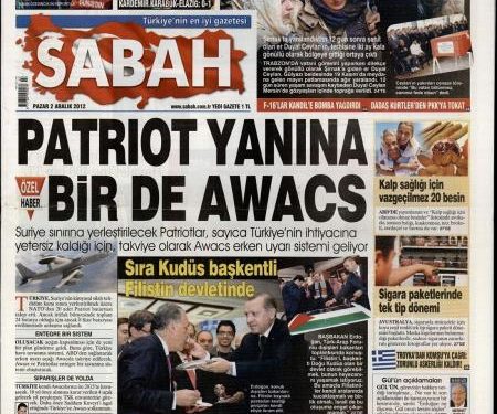 «Δίπλα στα Patriot και τα Αwacs» είναι ο τίτλος της Sabah. H τουρκική εφημερίδα αναφέρει πως «τα αντιπυραυλικά συστήματα Patriot τα οποία θα τοποθετηθούν στα σύνορα με τη Συρία. δεν θα είναι αρκετά έτσι οι ΗΠΣ θα στείλουν αεροσκάφη Awacs για την καλύτερη επιτήρηση της ευρύτερης περοχής».