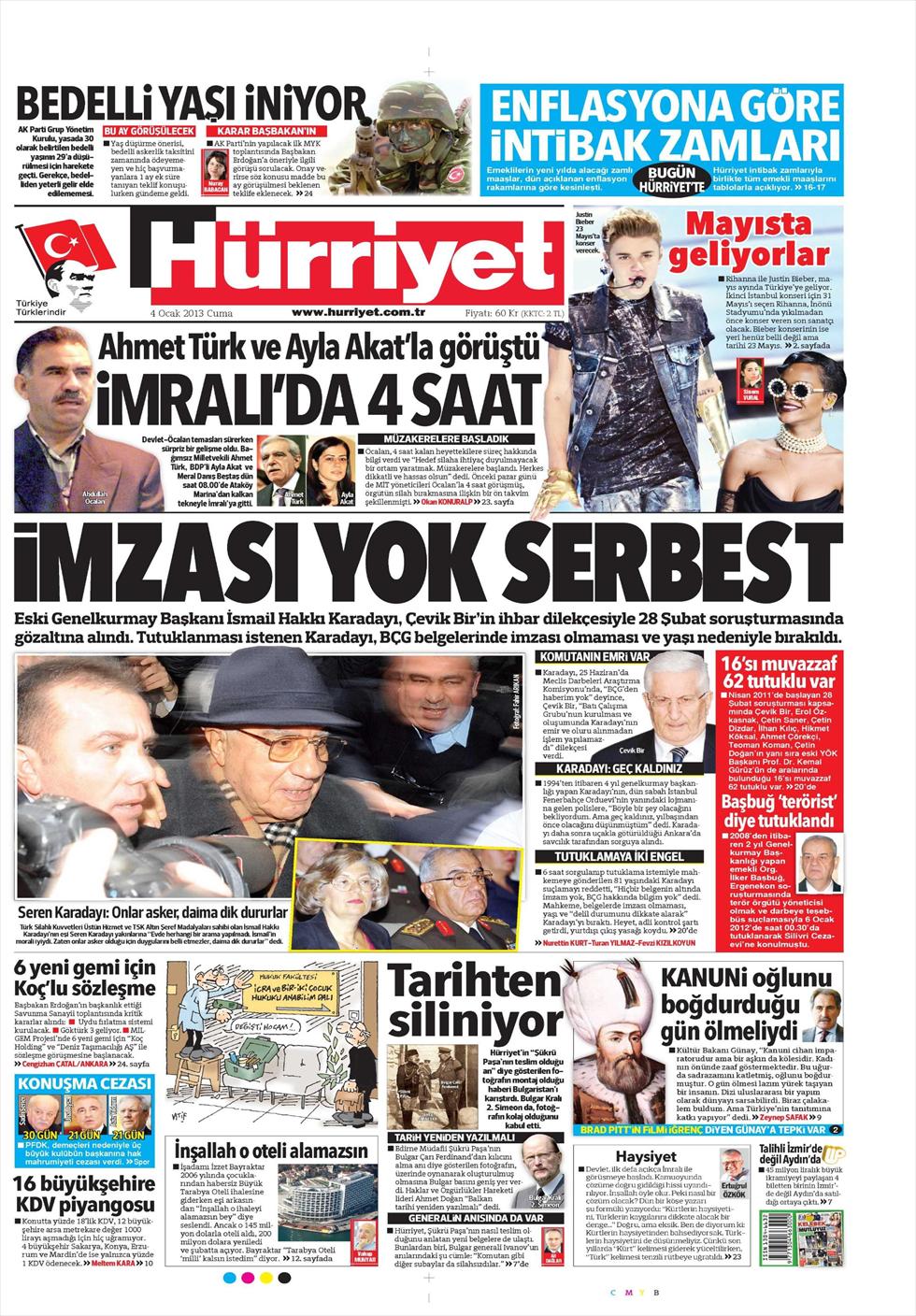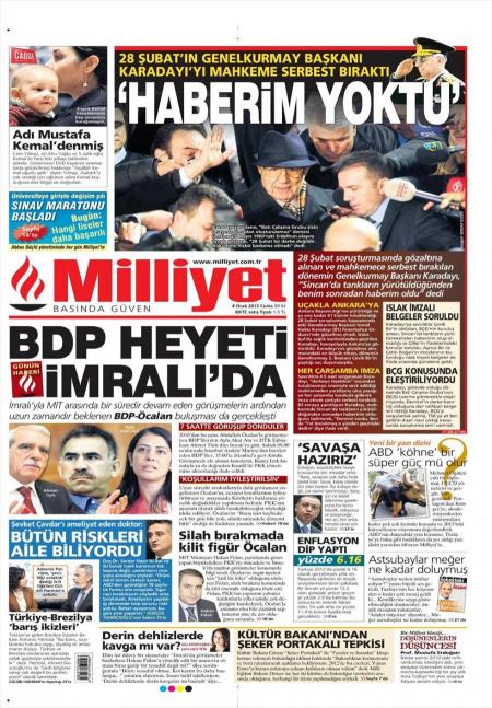 « Στο Ιμραλι, το κόμμα Ειρήνης και Δημοκρατίας» είναι ο τίτλος της Milliyet. H τουρκική εφημερίδα αναφέρει πως «μετά τις επαφές Οτζαλάν με τη ΜΙΤ, πραγματοποιήθηκε η αναμενόμενη συνάντηση των βουλευτών του Κόμματος Ειρήνης και Δημοκρατίας με τον Αμντουλάχ Οτζαλάν που τον επισκέφθηκαν στο Ιμραλι όπου είναι φυλακισμένος.