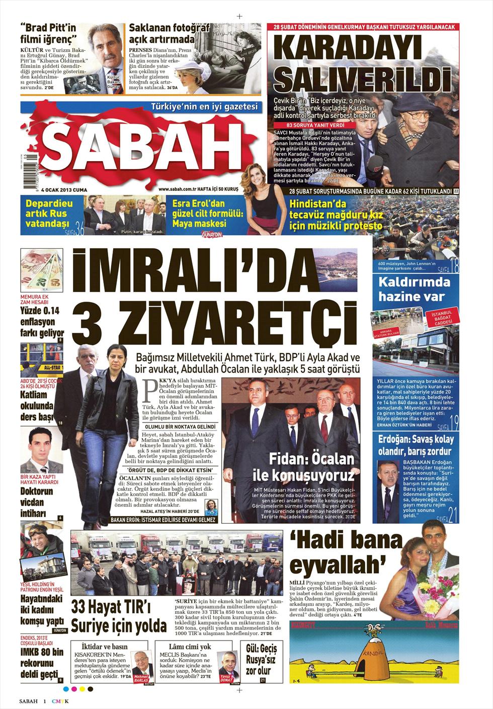 «Τρεις επισκέπτες στο Ίμραλι» είναι ο τίτλος της Sabah. H τουρκική εφημερίδα αναφέρει πως οι βουλευτές Αχμέτ Τούρκ και η Αϊλά Ακάτ μαζί με έναν δικηγόρο «συναντήθηκαν και συνομίλησαν με τον Αμντουλάχ Οτζαλάν για περίπου 5 ώρες». Σύμφωνα με την εφημερίδα ο Οτζαλάν τόνισε πως έχουν φτάσει σε θετικό σημείο οι συνομιλίες με την Άγκυρα.
