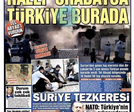 “ Bαριά πρόκληση από την Δαμασκό» είναι ο τίτλος της εφημερίδας Ζaman. H τουρκική εφημερίδα αναφέρει πως η Συρία χτύπησε με το πυροβολικό την περιοχή Ακτσάκαλε στην Τουρκία και αναφέρει πως το τουρκικό πυροβολικό αργά το βράδυ άρχισε να ανταποδίδει με τον ίδιο τρόπο .