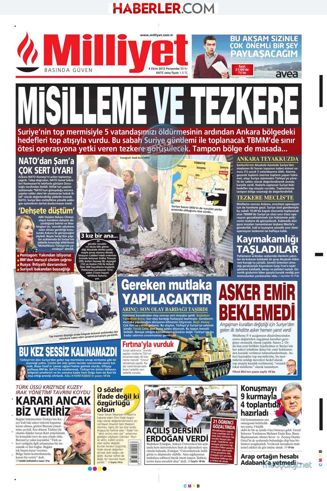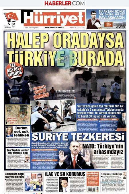 « Αν το Χαλέπι είναι εκεί, η Τουρκία είναι εδώ» είναι ο τίτλος της Hürriyet. H τουρκική εφημερίδα αναφέρει πως το τουρκικό πυροβολικό χτύπησε στόχους εντός της Συρίας μετά από την οβίδα που έπεσε στην περιοχή Ακτσάκαλε όπου σκοτώθηκαν 5 άνθρωποι. H Ηürriyet γράφει πως 16 στόχοι εντός της Συρίας χτυπήθηκαν με 50 βολές του τουρκικού πυροβολικού.