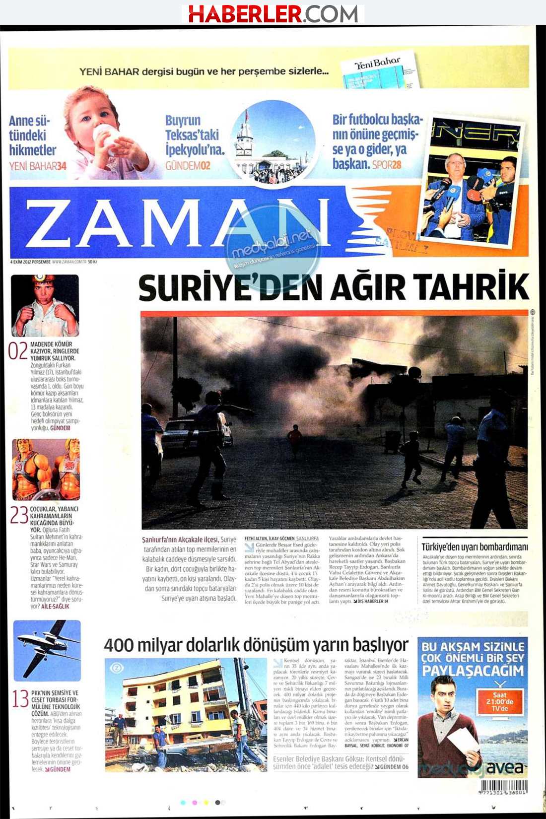 “ Bαριά πρόκληση από την Δαμασκό» είναι ο τίτλος της εφημερίδας Ζaman. H τουρκική εφημερίδα αναφέρει πως η Συρία χτύπησε με το πυροβολικό την περιοχή Ακτσάκαλε στην Τουρκία και αναφέρει πως το τουρκικό πυροβολικό αργά το βράδυ άρχισε να ανταποδίδει με τον ίδιο τρόπο .