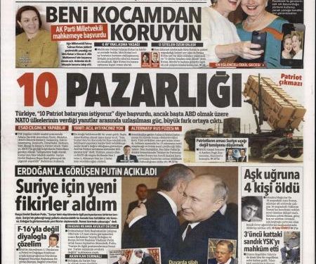 «To παζάρι για το 10» είναι ο τίτλος της Hürrriyet. H τουρκική εφημερίδα αναφέρει πως η Τουρκία έχει ζητήσει από το ΝΑΤΟ 10 συστοιχίες Patriot στα σύνορα της με τη Συρία. «Όμως οι απαντήσεις που έχει λάβει από τις ΗΠΑ αλλά και από το ΝΑΤΟ δείχνουν πως η συμμαχία δεν μπορεί να στείλει περισσότερες από 4 συστοιχίες».