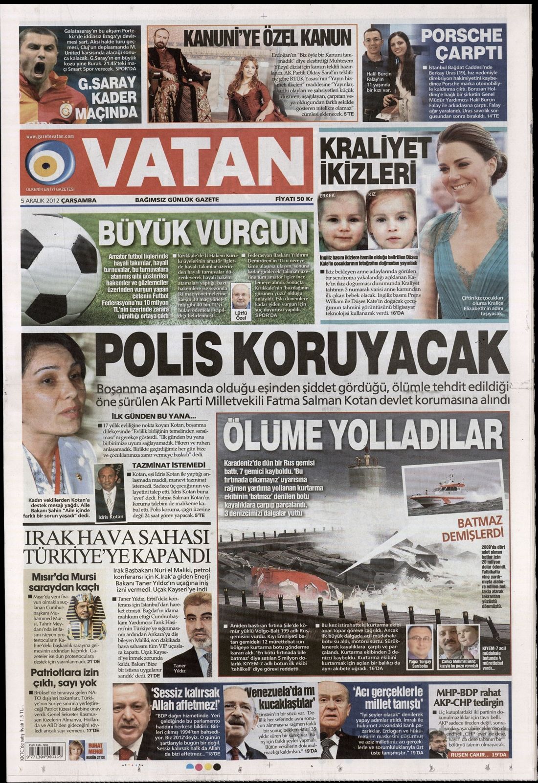 «Θα την φρουρεί η αστυνομία» είναι ο τίτλος της Vatan. H τουρκική εφημερίδα αναφέρεται στο διαζύγιο της βουλευτού του κυβερνώντος κόμματος Δικαιοσύνης και Ανάπτυξης Φατμά Κοτάν, η οποία δέχονταν βίαιη συμπεριφορά από το σύζυγο της και θα φρουρείται για τον λόγο αυτό από την αστυνομία.