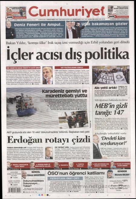 «Τραγική εξωτερική πολιτική» είναι ο τίτλος της Cumhuriyet. H τουρκική εφημερίδα αναφέρεται στην απαγόρευση της πτήσης του τούρκου Υπουργού Ενέργειας Τανέρ Γιλντίζ προς το Βόρειο Ιράκ όπου απαγορεύθηκε από την κεντρική κυβέρνηση της Βαγδάτης. Η Cumhuriyet αναφέρει πως οι σχέσεις με τη Βαδάτη έχουν επιδεινωθεί σε δραματικά επίπεδα.