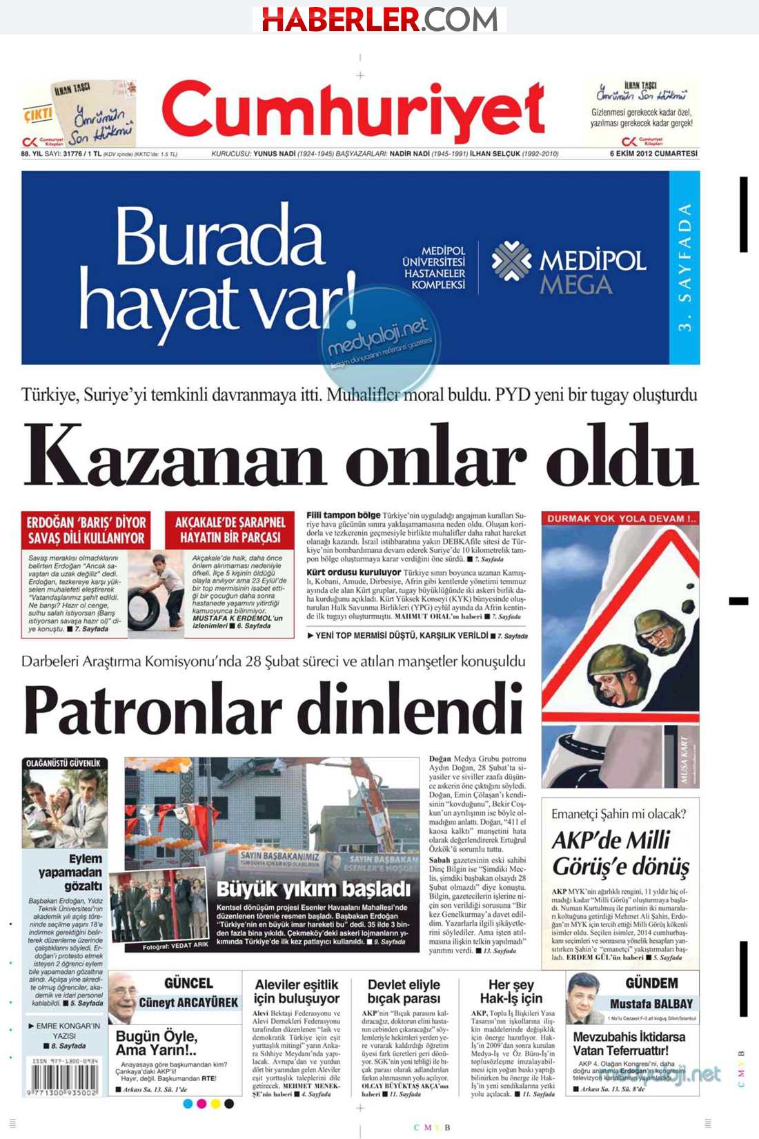 « Εκείνοι βγήκαν κερδισμένοι» είναι ο τίτλος της Cumhuriyet. H τουρκική εφημερίδα αναφέρει πως οι Κούρδοι έχουν βγει κερδισμένοι από την κρίση ανάμεσα στη Συρία και την Τουρκία. Σύμφωνα με την Cumhuriyet ο Άσαντ έχει δώσει εντολή απομάκρυνσης των δυνάμεων από τα σύνορα αφήνοντας τις περιοχές στα χέρια των Κούρδων , οι οποίοι έχουν δημιουργήσει δυο ταξιαρχίες στρατού.