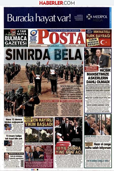 «Μπελάς στα σύνορα» είναι ο τίτλος της εφημερίδας Posta. H τουρκική εφημερίδα αναφέρει πως το παρακλάδι του PKK στη Συρία το PYD εκμεταλλευόμενο το κενό εξουσίας στη Συρία ανακοίνωσε τη δημιουργία ταξιαρχίας και έκανε επίδειξη δύναμης σε απόσταση 15 χιλιομέτρων από τα σύνορα της Τουρκίας.