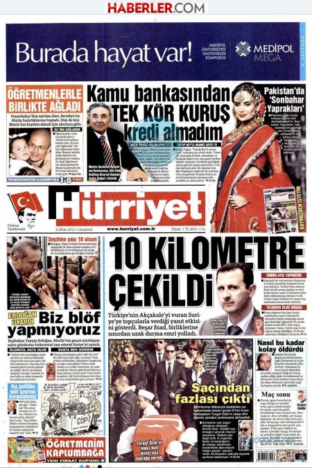 «Υποχώρησε 10 χιλιόμετρα” είναι ο τίτλος της Hürriyet. H τουρκική εφημερίδα αναφέρει πως « η απάντηση της Τουρκίας στη ρίψη οβίδας το Ακτσάκαλε έφερε αποτελέσματα καθώς ο Άσαντ έδωσε εντολή στις δυνάμεις του για να παραμένουν σε μακρινή απόσταση από τα σύνορα»