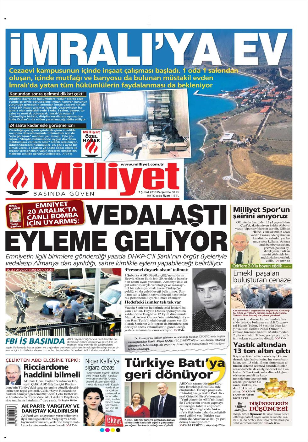 «Σπίτι στο Ιμραλι» είναι ο τίτλος της Milliyet. H τουρκική εφημερίδα γράφει πως ξεκίνησε η κατασκευή σπιτιού το οποίο θα χρησιμοποιείται από φυλακισμένους ου δείχνουν καλή συμπεριφορά. Η εφημερίδα τονίζει πως ίσως αυτό το σπίτι να χτίζεται για τον Οτζαλάν που ενδέχεται να βελτιωθούν οι συνθήκες κράτησης του που είναι πάγιο αίτημα των Κούρδων.