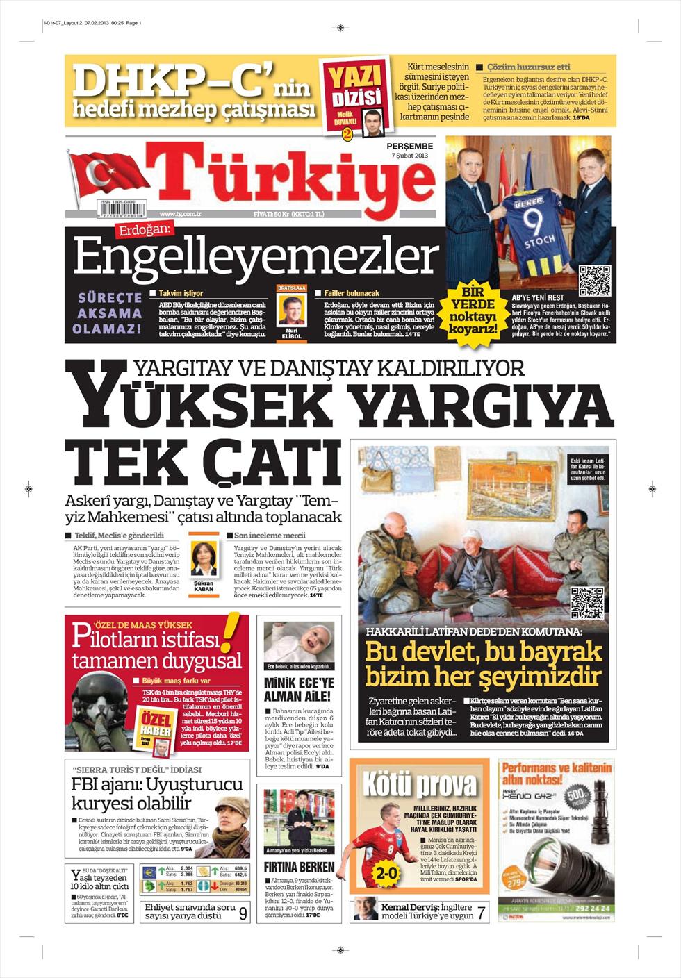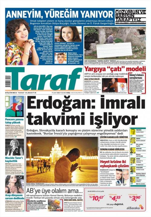 “Ερντογάν: η πορεία του Ιμραλι συνεχίζεται κανονικά» είναι ο τίτλος της Taraf. H τουρκική εφημερίδα γράφει πως παρά τα τρομοκρατικά χτυπήματα ο τούρκος πρωθυπουργός δήλωσε πως τίποτα δεν μπορεί να εμποδίσει τις διαπραγματεύσεις που συνεχίζονται σχετικά με την επίλυση του Κουρδικού ζητήματος.