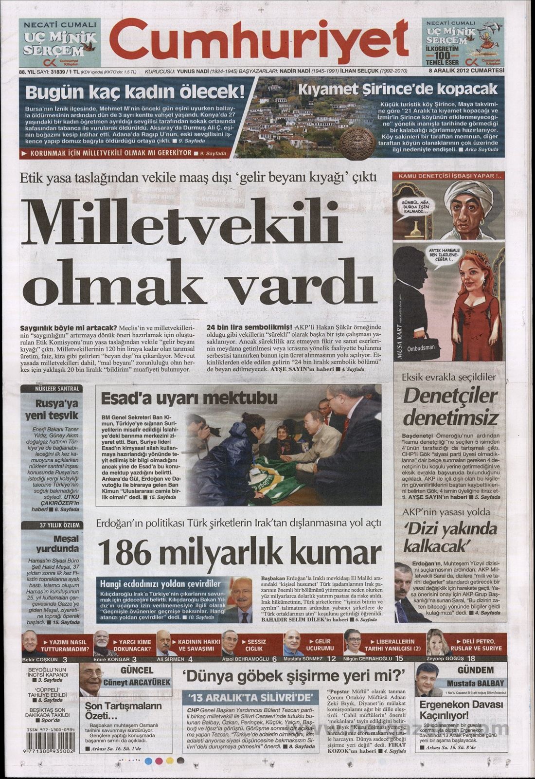 «Ηταν να ήμασταν βουλευτές» είναι ο τίτλος της Cumhuriyet. H τουρκική εφημερίδα γράφει πως οι τούρκοι βουλευτές με νόμους που ψηφίζουν οι ίδιοι αύξησαν τις φοροαπαλλαγές τους αλλά και τις αμοιβές τους εκτός από μισθούς και επιδόματα σε αντίθεση με όσα ζει η τουρκική κοινωνία.