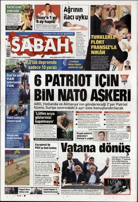 «1000 στρατιώτες του για 6 συστοιχίες Patriot» είναι ο τίτλος της Sabah. H τουρκική εφημερίδα γράφει πως η Γερμανία, η Ολλανδία και οι ΗΠΑ θα στείλουν από δυο συστοιχίες οι οποίες θα εγκατασταθούν σε έξι διαφορετικές βάσεις στα σύνορα με τη Συρία. Η ίδια εφημερίδα τονίζει πως περίπου 1000 στρατιώτες του ΝΑΤΟ θα εγκατασταθούν στη Τουρκία για την λειτουργία των συστημάτων.