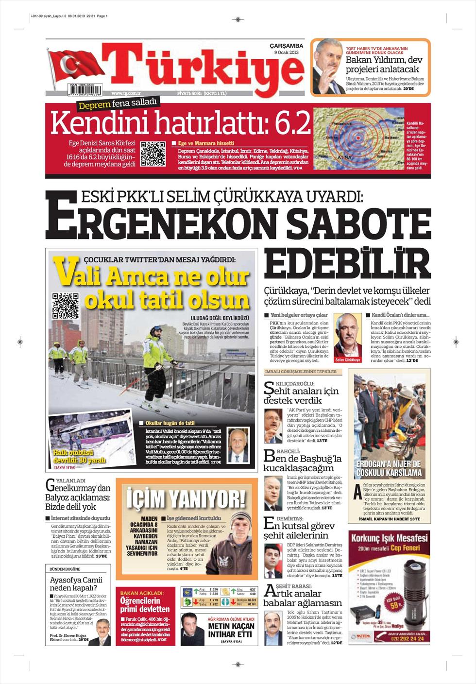«Η Εργκενεκόν μπορεί να σαμποτάρει τη διαδικασία» είναι ο τίτλος τη Τürkiye. H τουρκική εφημερίδα αναφέρεται σε δηλώσεις πρώην μέλους του PKK, Σελίμ Τσουρούκαγια, o οποίος προειδοποιεί πως « η οργάνωση «Εργκενεκόν» αλλά και γειτονικές χώρες ενδέχεται να προσπαθήσουν να σαμποτάρουν την προσπάθεια επίλυσης του Κουρδικού ζητήματος».