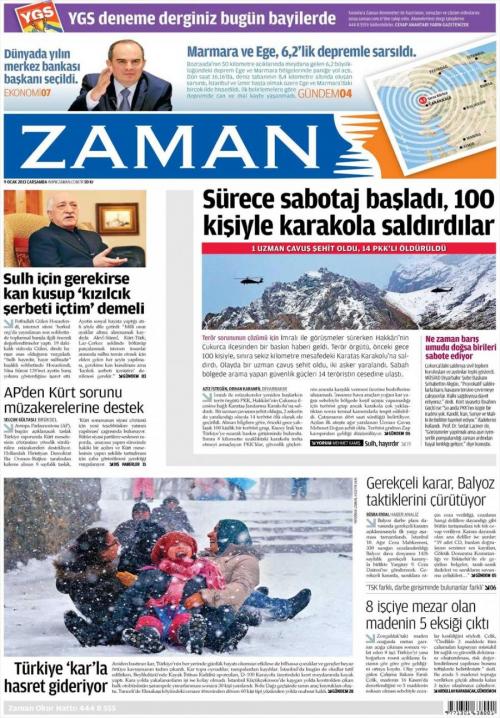 «Ξεκίνησε το σαμποτάζ στη διαδικασία επίλυσης επιτέθηκαν σε φυλάκιο με 100 άνδρες» είναι ο τίτλος της Zaman. H τουρκική εφημερίδα αναφέρει πως παρά τις προσπάθειες επίλυσης του Κουρδικού, «κάποιοι προσπαθούν να σαμποτάρουν την προσπάθεια και γι’αυτό χθες έγινε η επίθεση σε φυλάκιο στην περιοχή Τσουκούρτζα , σε απόσταση 8 χιλιομέτρων από τα σύνορα. Σκοτώθηκε ένας λοχαγός, τραυματίστηκαν δυο στρατιώτες. 14 μέλη του PKK σκοτώθηκαν μετά από τις επιχειρήσεις του στρατού»