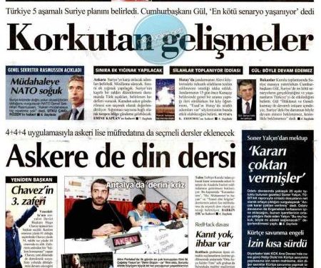 «Γίνεται πραγματικότητα το χειρότερο σενάριο» είναι ο τίτλος της τουρκικής εφημερίδας Taraf. H εφημερίδα αναφέρει πως ο τούρκος πρόεδρος Αμντουλάχ Γκιουλ αναφέρει πως στο θέμα της Συρίας συμβαίνει το χειρότερο σενάριο « δεν μπορεί να συνχειστεί αυτή η κατάσταση» αναφέρει.