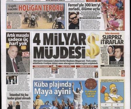 «Ευχάριστο νέο 4 δισεκατομμυρίων δολαρίων» είναι ο τίτλος της Hürrriyet. H τουρκική εφημερίδα κάνει αναφορά στις δηλώσεις του προέδρου της Λιβύης Μουχάμαντ Γιουσούρ Μαγκαριάφ, ο οποίος αναφέρει πως οι τούρκοι εργολάβοι θα πληρωθούν άμεσα 4 δισεκατομμύρια δολάρια απο τις οφειλές του παρελθόντος.