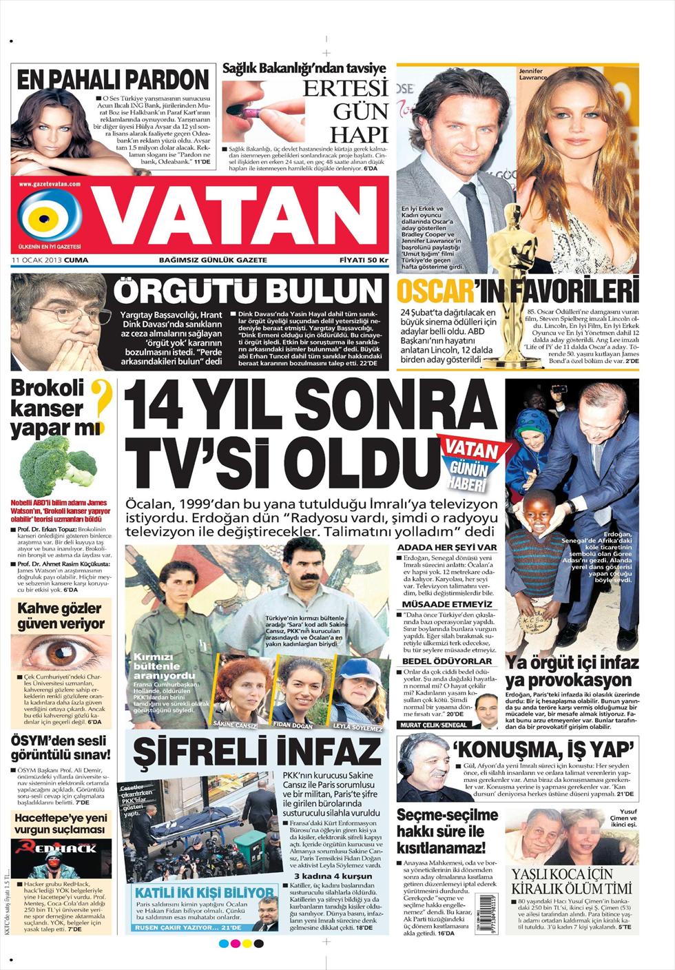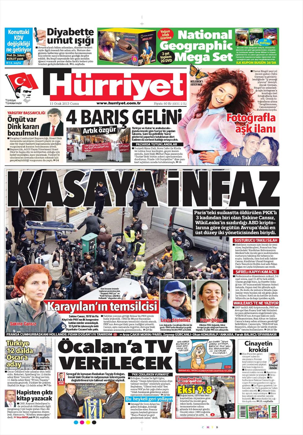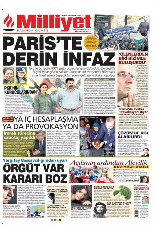 «Βαθιά εκτέλεση στο Παρίσι» είναι ο τίτλος της Milliyet. H τουρκική εφημερίδα αναφέρει πως « τρεις γυναίκες μέλη του PKK δολοφονήθηκαν με όπλα με σιγαστήρα στο Παρίσι. Μια από τις γυναίκες ήταν η Σακινέ Τζανσίζ η οποία είχε μεγάλο κύρος στην οργάνωση. Κανείς δεν γνωρίζει τα αίτια της δολοφονίας όμως προκαλεί εντύπωση καθώς έγινε κατά τη διάρκεια της έναρξης των συνομιλιών για την επίλυση του Κουρδικού ζητήματος».