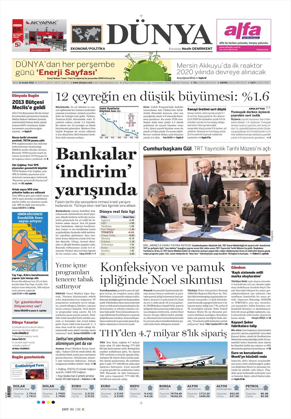 «Η μικρότερη ανάπτυξη των τελευταίων 12 τριμήνων-1.6%» είναι ο τίτλος της οικονομικής εφημερίδας Dünya. H τουρκική εφημερίδα αναφέρει πως έχει μειωθεί δραματικά ο ρυθμός ανάπτυξης της οικονομίας στην Τουρκία με αποτέλεσμα ο στόχος ανάπτυξης του 3.2% για το 2012 ενδέχεται να μην πετύχει.