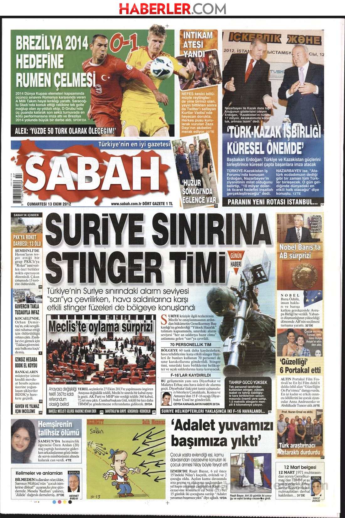 «Ομάδα Stinger στα σύνορα» είναι ο τίτλος της Sabah. H τουρκική εφημερίδα αναφέρει πως στα σύνορα με τη Συρία οι στρατιωτικές μονάδες έχουν τεθεί σε κίτρινο συναγερμό και έχουν εγκατασταθεί μονάδες Stinger «που είναι αποτελεσματικά όπλα στην αντιμετώπιση αεροπορικών επιδρομών».