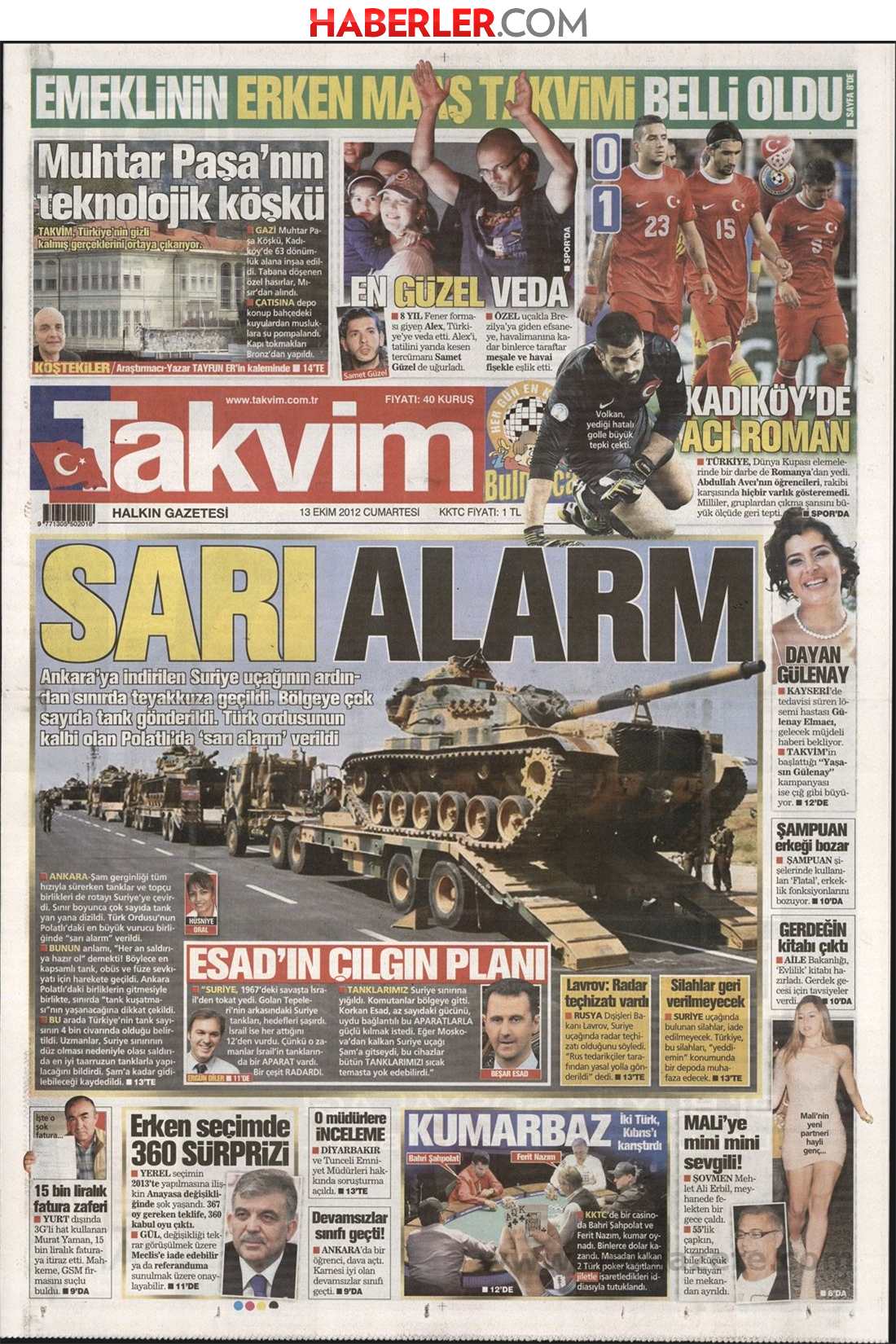 «Κίτρινος συναγερμός» είναι ο τίτλος της Takvim. H τουρκική εφημερίδα γράφει πως το μεγαλύτερο τάγμα του τουρκικού στρατού στο Πολάτλι κοντά στην Άγκυρα έχει τεθεί σε αυξημένη επιφυλακή και ήδη στέλνονται τεθωρακισμένα στα σύνορα με τη Συρία.