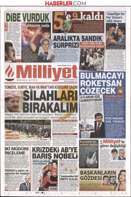 «Να αφήσουμε τα όπλα» είναι ο τίτλος της Milliyet η οποία κάνει αναφορά στις δηλώσεις του ηγέτη των Κούρδων του Βόρειου Ιράκ Μασούντ Μπαρζανί. Ο Κούρδος ηγέτης απευθύνεται στους ομοεθνείς του στο Ιράν,στην Τουρκία , της Συρίας και του Ιράκ και δηλώνει « πέρασαν οι εποχές των ενόπλων αγώνων. Τώρα πρέπει να βρισκόμαστε στα Κοινοβούλια»