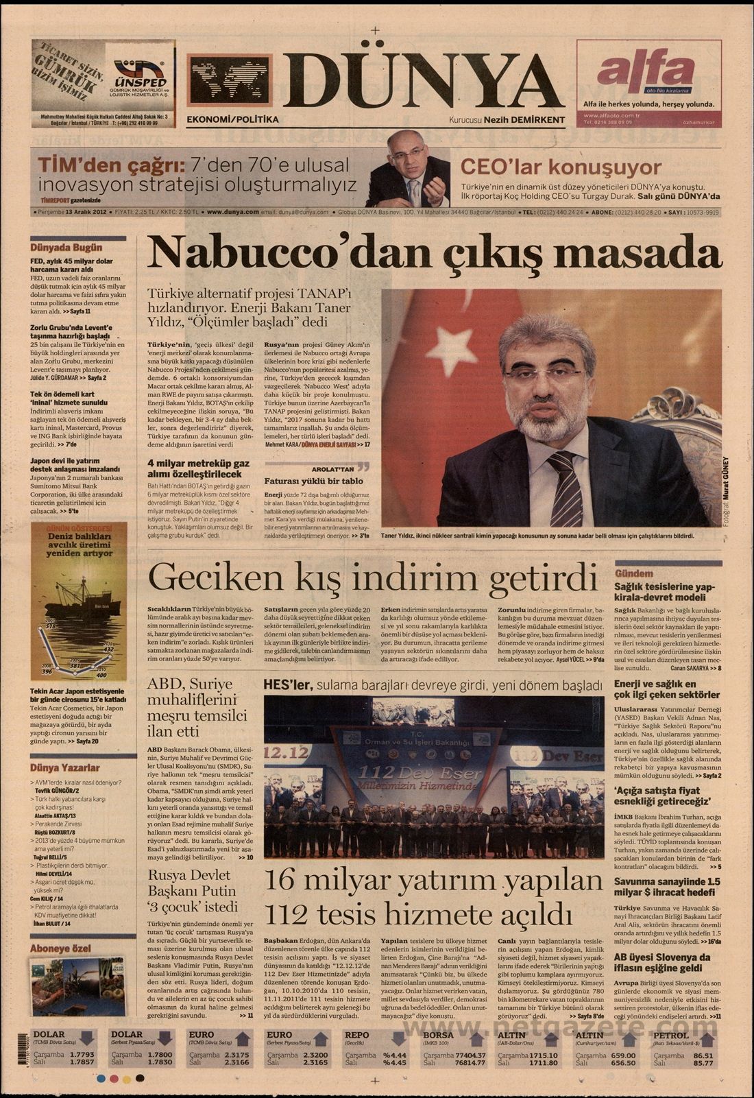 «Η έξοδος από το Nabucco είναι πάνω στο τραπέζι» είναι ο τίτλος της οικονομικής εφημερίδας Dünya. H τουρκική εφημερίδα αναφέρει πως η Άγκυρα ενδέχεται να αποχωρήσει από το σχέδιο κατασκευής του αγωγού φυσικού αερίου Nabucco και εξετάζει το ενδεχόμενο κατασκευής ενός εναλλακτικού αγωγού με την ονομασία ΤΑΝΑP.