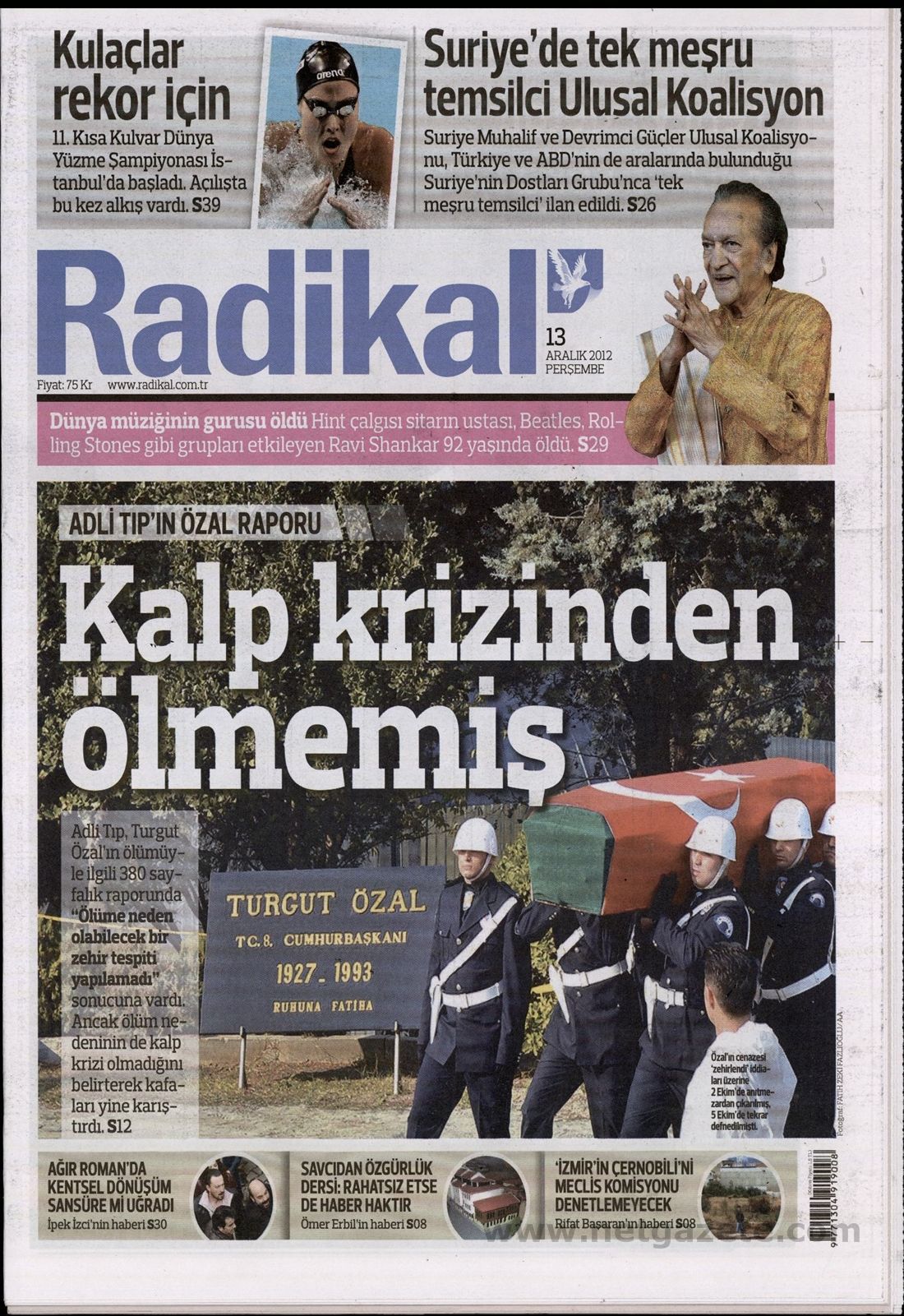 «Δεν πέθανε από καρδιακή προσβολή» είναι ο τίτλος της Radikal. Η τουρκική εφημερίδα αναφέρει πως η ιατροδικαστική έκθεση για τον πρώην πρόεδρο της Τουρκίας εκτός που αναφέρει πως βρέθηκε δηλητήριο στη σορό, τονίζει πως ο Οζάλ δεν πέθανε από καρδιακή προσβολή! «Αυτό μπερδεύει ακόμη περισσότερο τα πράγματα» τονίζει η Radikal.
