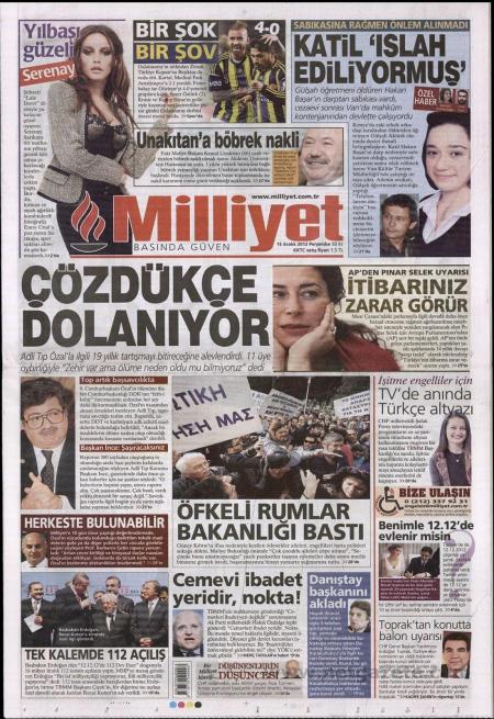 «Οσο επιλύεται τόσο περιπλέκεται» είναι ο τίτλος της Milliyet. H τουρκική εφημερίδα αναφέρεται στο θέμα της ιατροδικαστικής έκθεση του Οζάλ και γράφει πως «19 χρόνια μετά τον θάνατο του η έκθεση αντί να ξεκαθαρίσει τις υποθέσεις απλά τις φούντωσε καθώς ομόφωνα η επιτροπή τόνισε πως στη σορό του Οζάλ βρέθηκε δηλητήριο αλλά δεν ξέρει αν προκάλεσε τον θάνατο».