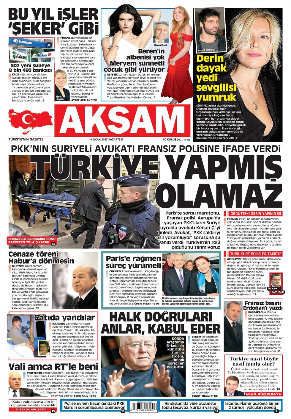 «Δεν μπορεί να το έχει κάνει η Τουρκία» είναι ο τίτλος της Akşam. H τουρκική εφημερίδα αναφέρεται στην επίθεση όπου είχαν δολοφονηθεί οι τρεις ακτιβίστριες μέλη του PKK και τονίζει πως ο δικηγόρος τους στην ανάκριση του τόνισε πως «το PKK θεωρεί πως στη δολοφονία δεν έχει σχέση η Άγκυρα».