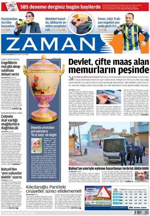 «Το κράτος αναζητά τους δημοσίους υπαλλήλους με διπλό μισθό» είναι ο τίτλος της Zaman. H τουρκική εφημερίδα γράφει πως γίνονται έρευνες για τους δημοσίους υπαλλήλους οι οποίοι έχουν πάρει σύνταξη από έναν οργανισμό και εργάζονται κανονικά σε άλλο τομέα του δημοσίου. «Αυτοί οι υπάλληλοι μέχρι στιγμής είναι χίλιοι και αναζητούνται κι άλλοι» γράφει η Zaman.