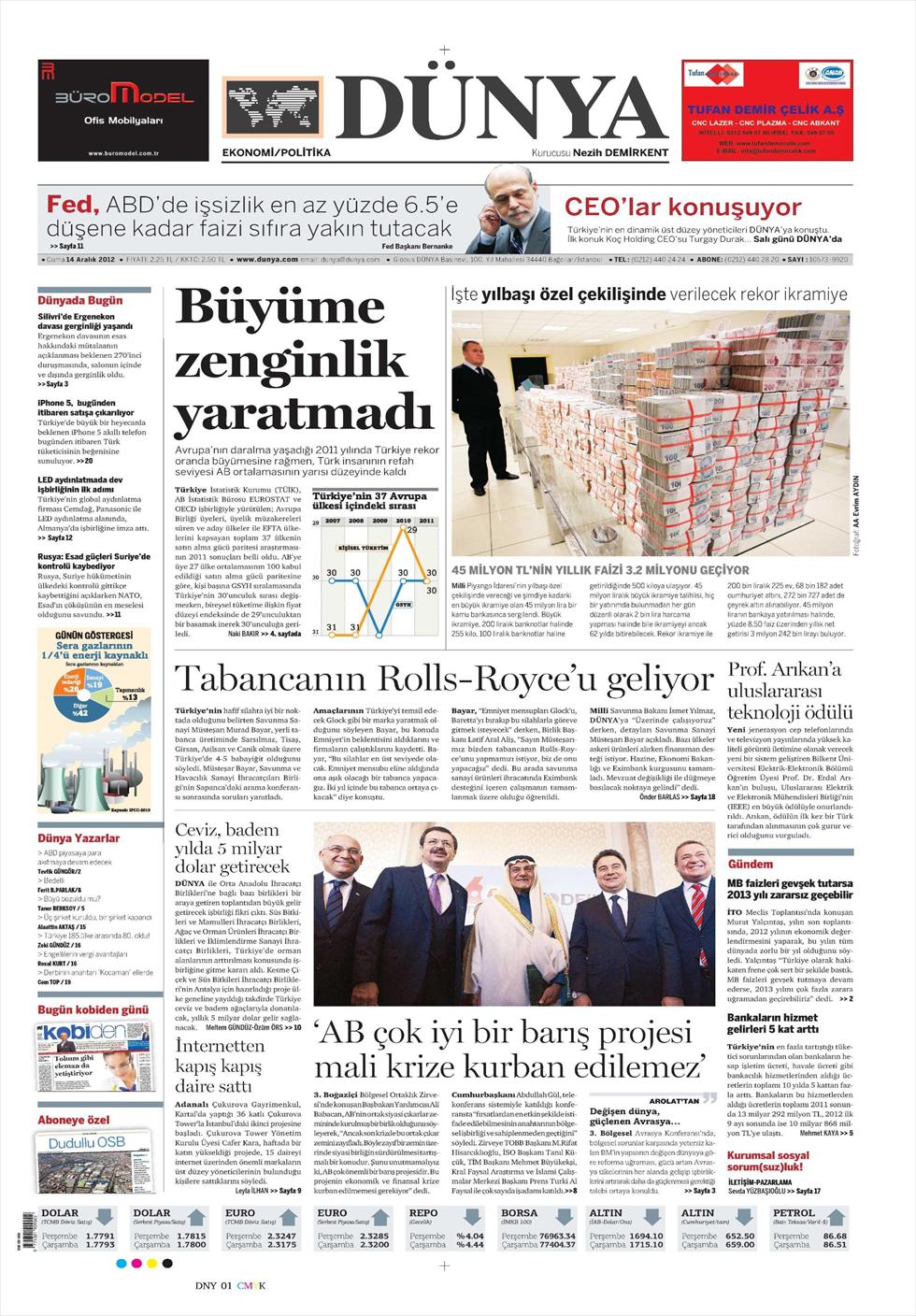 «Η ανάπτυξη δεν έφερε πλούτο» είναι ο τίτλος της Dünya. H τουρκική εφημερίδα αναφέρει πως η Τουρκία αναπτύχθηκε σε επίπεδα ρεκόρ σε σχέση με την Ευρώπη όμως το επίπεδο πλούτου των Τούρκων παρέμεινε περίπου στο 50% σε σχέση μ’αυτό των Ευρωπαίων.