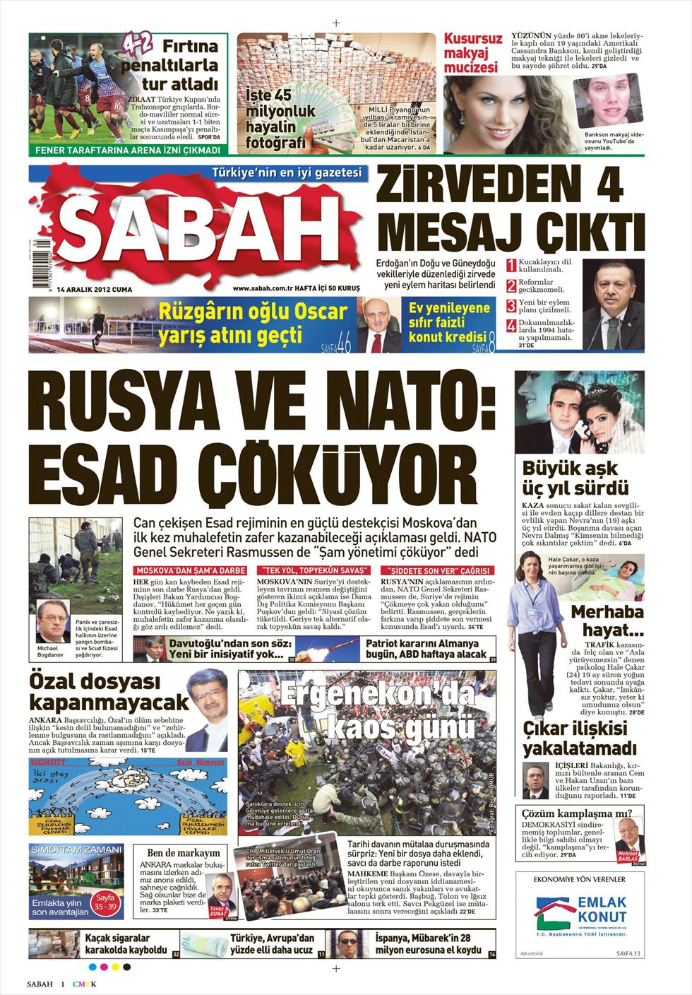 «Ρωσία και ΝΑΤΟ εκτιμούν πως ο Άσαντ καταρρέει» είναι ο τίτλος της Sabah. H εφημερίδα αναφέρει πως ο σημαντικότερος υποστηρικτής του Άσαντ όπου θεωρείται η Ρωσία εκτιμά πως ο Άσαντ χάνει στα μέτωπα με τους αντάρτες και ενδέχεται σύντομα να αποχωρήσει από την εξουσία.