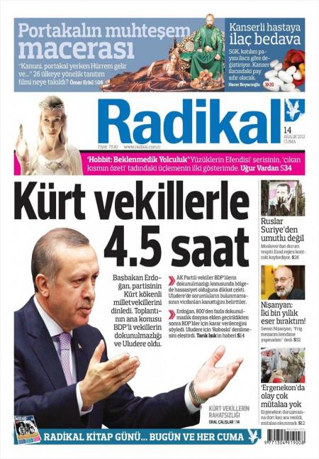 “4.5 ώρες με τους Κούρδους βουλευτές» είναι ο τίτλος της Radikal. H τουρκική εφημερίδα αναφέρει πως ο Ρετζέπ Ταγίπ Ερντογάν κάλεσε τους κουρδικής καταγωγής βουλευτές του κόμματος του και συζήτησε μαζί τους πολλά θέματα που αφορούν τους Κούρδους αλλά και το ζήτημα της άρσης της ασυλίας των Κούρδων βουλευτών του Κόμματος Ειρήνης και Δημοκρατίας.
