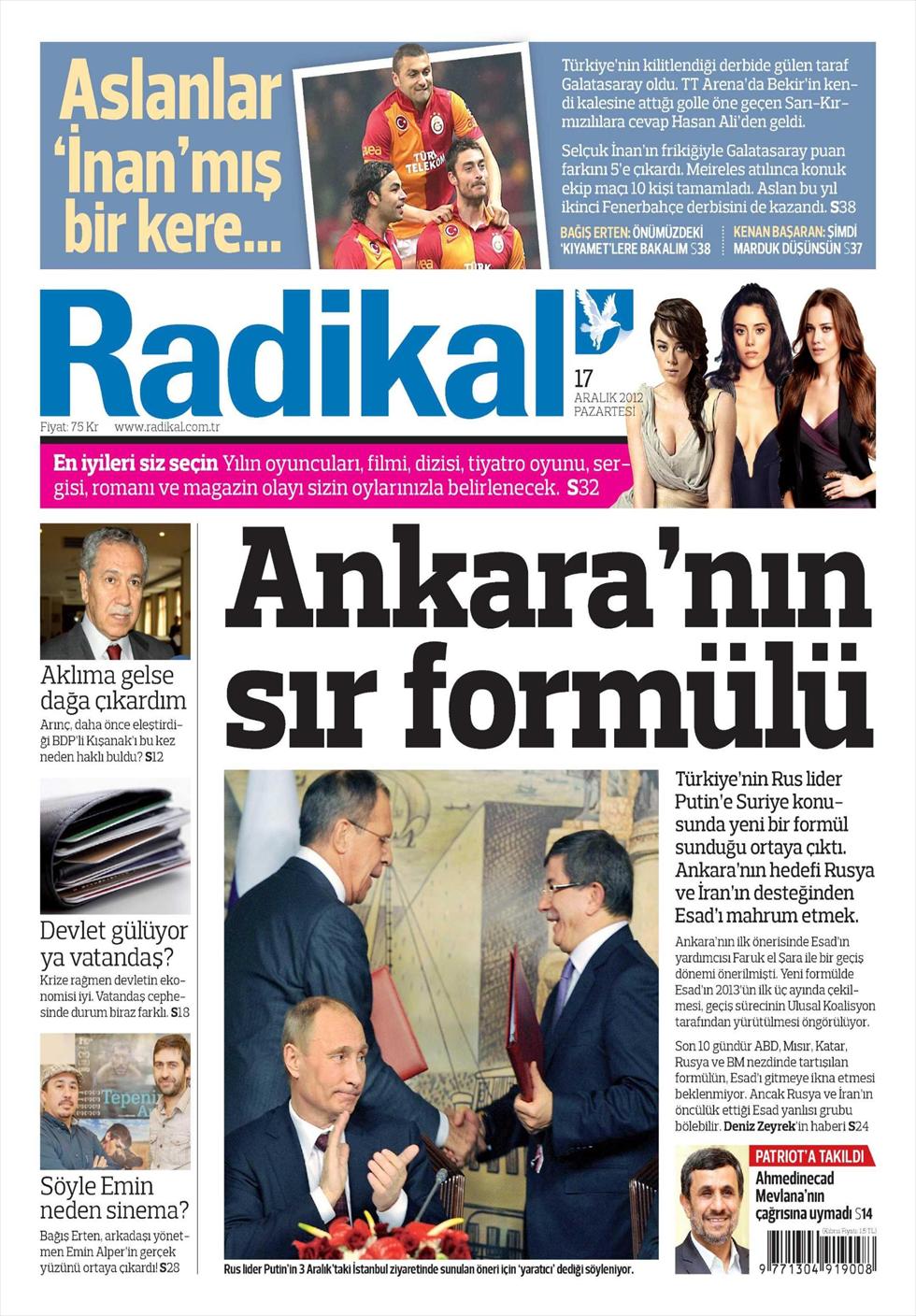 «Η μυστική φόρμουλα της Άγκυρας» είναι ο τίτλος της Radikal. H τουρκική εφημερίδα αναφέρει πως η τουρκική κυβέρνηση στην επίσκεψη του Πούτιν στην Άγκυρα παρέδωσε μια μυστική φόρμουλά που έχει ως στόχο την εξάλειψη της στήριξης που έχει ο Άσαντ από το Ιράν και τη Ρωσία.