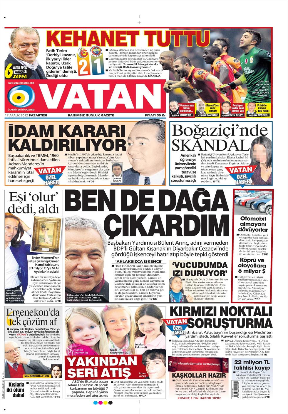 «Κι εγώ θα ανέβαινα στο βουνό» είναι ο τίτλος της Vatan. H τουρκική εφημερίδα αναφέρεται σε δηλώσεις του αντιπροέδρου της τουρκικής κυβέρνησης ο οποίος δηλώνει πως με τα βασανιστήρια που είχαν γίνει στο παρελθόν στη φυλακή του Ντιγιαρμπακίρ, αν βρίσκονταν και ο ίδιος εκεί, θα είχε γίνει αντάρτης!