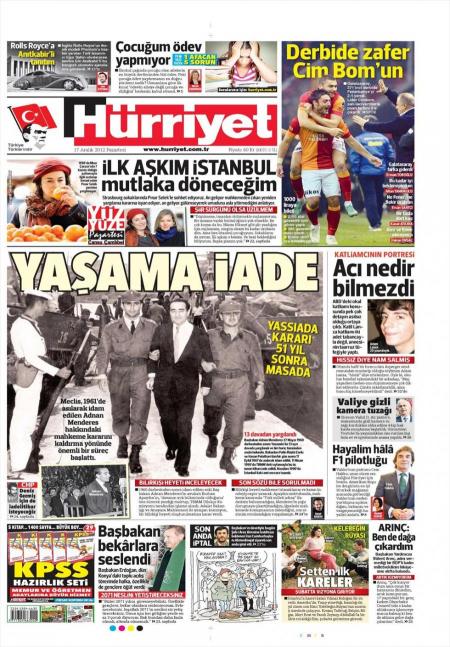 «Eπιστροφή στη ζωή» είναι ο τίτλος της Hürriyet. H τουρκική εφημερίδα αναφέρει πως το τουρκικό κοινοβούλιο ξεκίνησε μια σημαντική προσπάθεια για να ανακληθεί η απόφαση της εκτέλεσης του πρώην πρωθυπουργού Αντνάν Μεντερές και να του αποδοθούν οι τιμές τουλάχιστον για το όνομα του.