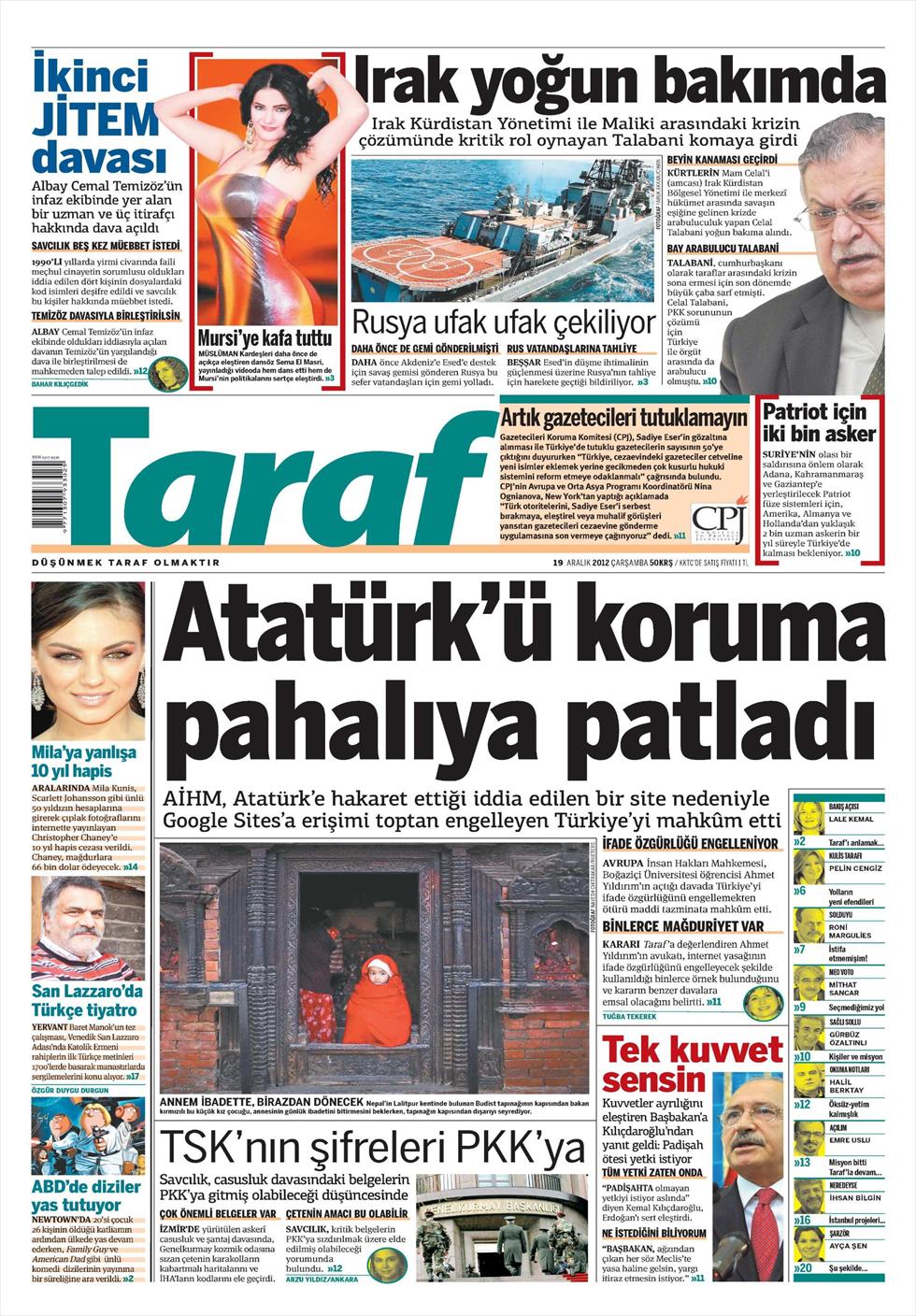 «Η προστασία του Ατατούρκ κόστισε ακριβά» είναι ο τίτλος της Taraf. H τουρκική εφημερίδα γράφει πως το Ευρωπαϊκό Δικαστήριο Ανθρωπίνων Δικαιωμάτων καταδίκασε την Τουρκία η οποία είχε απαγορεύσει στο παρελθόν την λειτουργία του Google καθώς θεωρούσε πως μια ιστοσελίδα είχε προσβάλλει τον Κεμάλ Ατατούρκ.