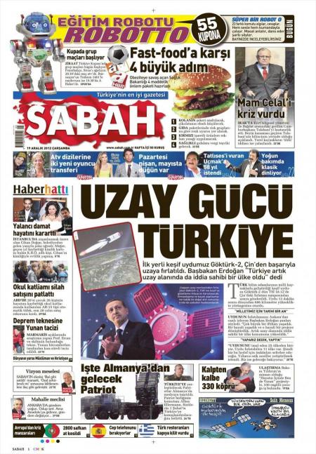 «Διαστημική δύναμη η Τουρκία» είναι ο τίτλος της Sabah. H τουρκική εφημερίδα αναφέρεται στην εκτόξευση του δορυφόρου Göktürk-2 και κάνει αναφορά στις δηλώσεις Ερντογάν ο οποίος τόνισε πως « η Τουρκία έγινε μια δύναμη που έχει λόγω και στο διάστημα».