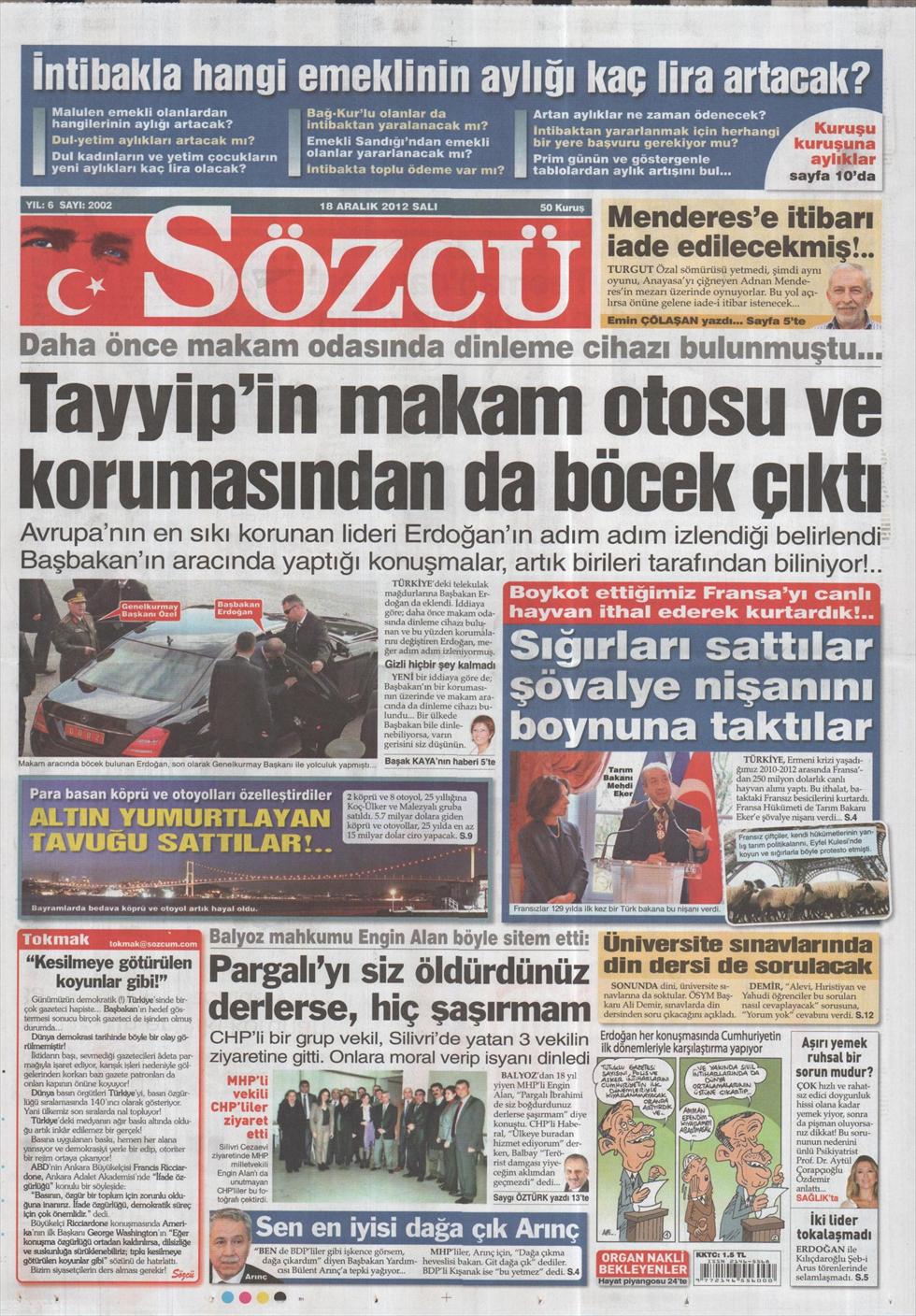 « Στο αυτοκίνητο του Ταγίπ βρέθηκε κοριός» είναι ο τίτλος της Sözcü.H τουρκική εφημερίδα αναφέρει πως στο αυτοκίνητο του τούρκου πρωθυπουργού αλλά και πάνω σε έναν φρουρό του βρέθηκαν κοριοί , όπου κάποιοι άκουγαν όλες τις συνομιλίες του τούρκου πρωθυπουργού. «Μας λένε πως ο Ερντογάν είναι ο πιο αυστηρά φρουρούμενος πρωθυπουργός της Ευρώπης αλλά είχαν βρεθεί κοριοί και στο γραφείο του» σχολιάζει η εφημερίδα.