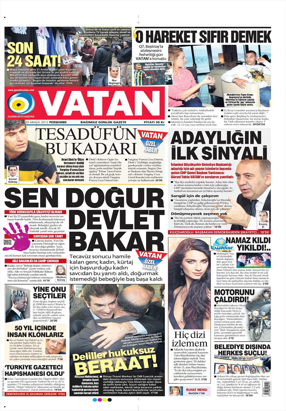«Εσυ να γεννήσεις το μωρό και το κράτος θα φορντίσει το παιδί σου» είναι ο τίτλος της Vatan. H τουρκική εφημερίδα αναφέρεται στην ιστορία μιας 23χρονης κοπέλας στην ανατολική Τουρκία όπου είχε μείνει έγκυος από βιασμό. Χωρίς να πει κάτι στους συγγενείς της ζήτησε τη βοήθεια του κράτους για να κάνει έκτρωση, ο εισαγγελέας δεν ενέκρινε καθώς είχε περάσει το νόμιμο όριο των 10 εβδομάδων . Το Υπουργείο Προστασίας Οικογένειας συνέστησε στην κοπέλα να γεννήσει το παιδί και αν δεν μπορεί να το φροντίζει αυτό θα τα κάνει το κράτος!