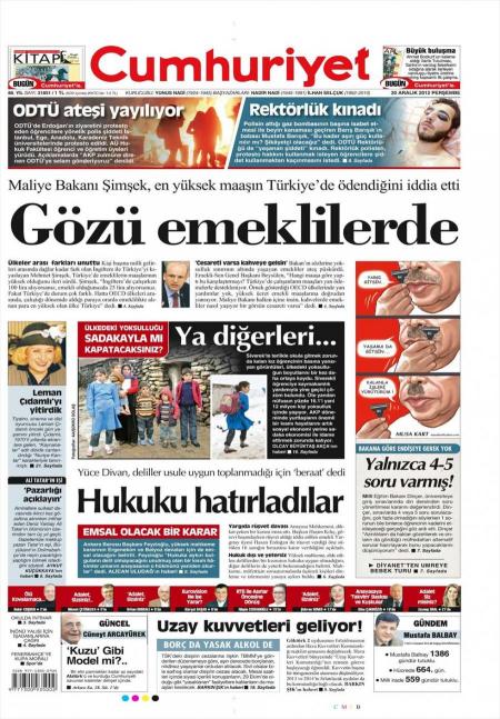 «Έβαλε στο μάτι τους συνταξιούχους» είναι ο τίτλος της Cumhuriyet. H τουρκική εφημερίδα αναφέρει πως ο Υπουργός Οικονομικών Μεχμέτ Σιμσέκ « ισχυρίστηκε πως οι Τούρκοι συνταξιούχοι παίρνουν περισσότερα χρήματα σε ποσοστό του μισθού , σε σχέση με τους συνταξιούχους της Μεγάλης Βρετανίας.» Η τουρκική εφημερίδα υποστηρίζει πως ο υπουργός εσκεμμένα αγνοεί τη μεγάλη διαφορά στους μισθούς των εργαζομένων ανάμεσα στις δυο χώρες.