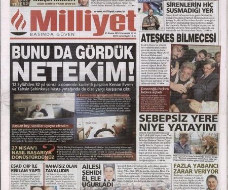 «Τελικά το είδαμε κι αυτό» είναι ο τίτλος της Milliyet. H τουρκική εφημερίδα αναφέρεται στη δίκη των πραξικοπηματιών του 1980. « Ο Κενάν Εβρέν και ο Ταχσίν Σαχίνκαγια 32 χρόνια μετά το στρατιωτικό πραξικόπημα έστω και από το κρεβάτι του νοσοκομείο έκατσαν στο εδώλιο μέσω τηλεδιάσκεψης»