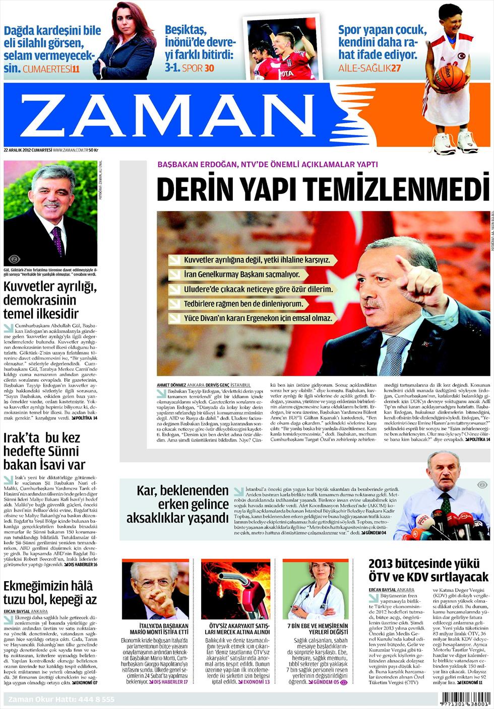 “ To βαθύ κράτος δεν τελείωσε ακόμα» είναι ο τίτλος της Zaman. H τουρκική εφημερίδα αναφέρεται σε δηλώσεις Ερντογά ο οποίος υποστηρίζει πως παρά τις προσπάθειες το βαθύ κράτος της Τουρκίας συνεχίζει να υπάρχει. Ο τούρκος πρωθυπουργός υποστηρίζει πως αυτό θα εξαλειφθεί μόνο με το πέρασμα του χρόνου.