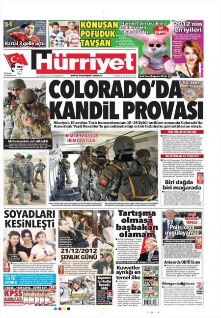 “Πρόβα στο Κολοράντο για το όρος Καντίλ» είναι ο τίτλος της Ηürriyet. H τουρκική εφημερίδα δημοσιεύει φωτογραφίες από τις κοινές ασκήσεις που είχαν κάνει τον Σεπτέμβριο, τούρκοι κομάντος με αμερικανούς συναδέλφους τους στις ΗΠΑ. Η εφημερίδα γράφει πως η άσκηση αυτή ήταν πρόβα για επέμβαση στο όρος Καντίλ στο Βόρειο Ιράκ εναντίον του PKK.