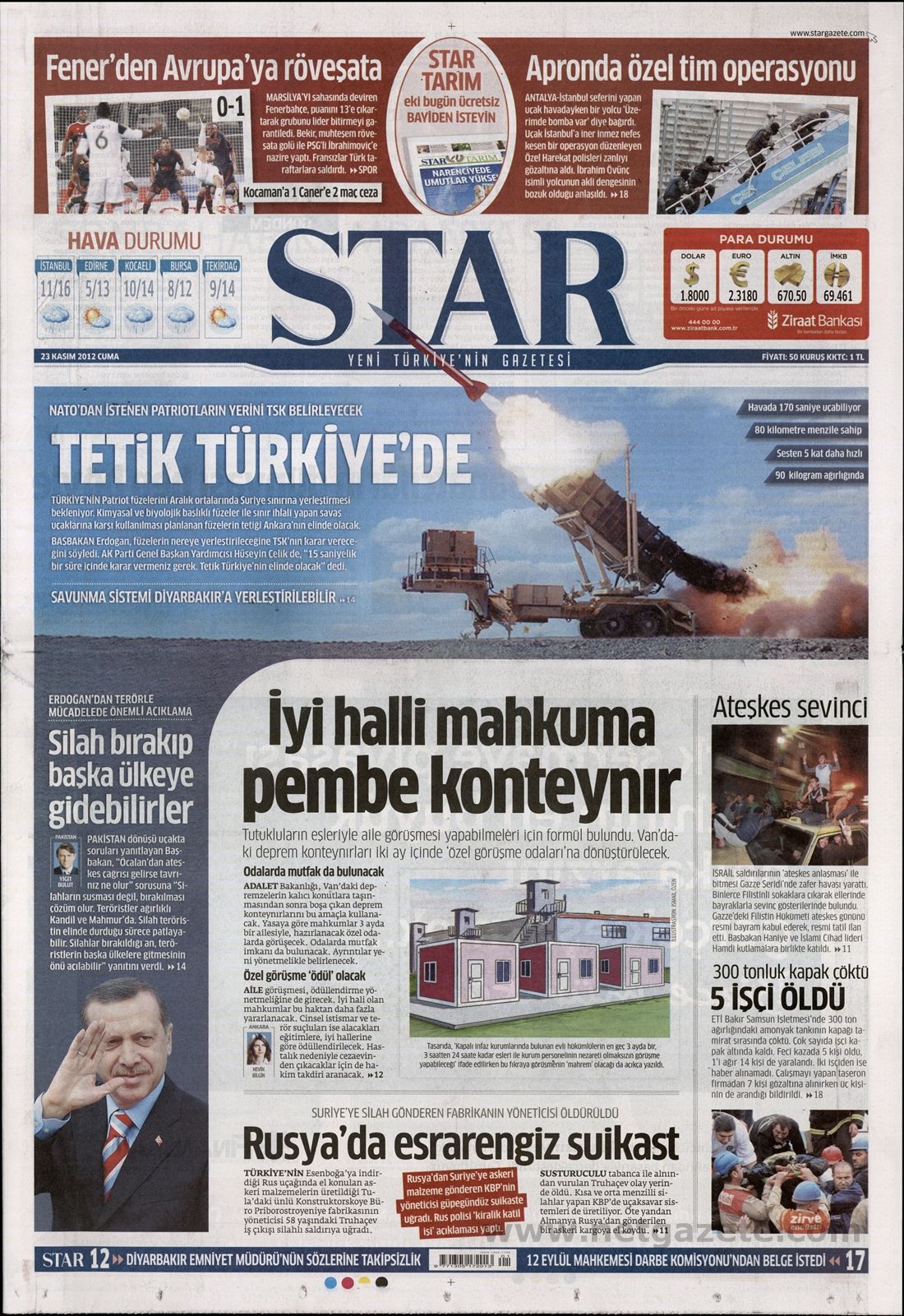 «Η σκανδάλη είναι στην Τουρκία» είναι ο τίτλος της Star . Η τουρκική εφημερίδα αναφέρει πως σύμφωνα με πληροφορίες του τουρκικού στρατού, τα Patriot τα οποία θα τοποθετήσει το ΝΑΤΟ στην Τουρκία θα το χειρίζονται τούρκοι αξιωματικοί.