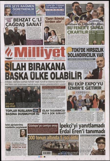 «Σε όποιον αφήσει τα όπλα ίσως να παει στο εξωτερικό» ίναι ο τίτλος της Μilliyet που κάνει αναφορά στις δηλώσεις Ερντογάν σχετικά με την περίπτως γενικής ασυλίας στους αντάρτες του PKK. Ο τούρκος πρωθυπουργός μιλά για ενδεχόμενο κάποιου είδους λύσης στο θέμα.