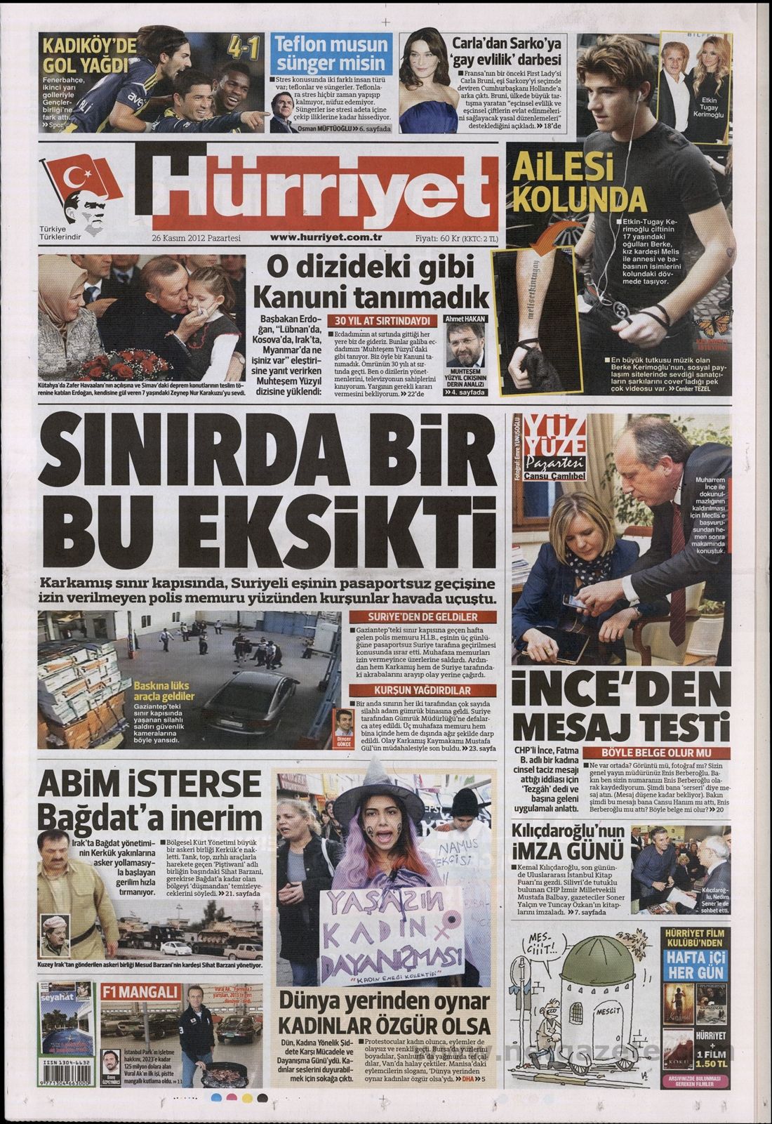 «Στα σύνορα μόνο αυτό μας έλειπε» είναι ο τίτλος της Hürriyet. H τουρκική εφημερίδα αναφέρει πως «στα σύνορα Συρίας-Τουρκίας, αστυνομικός προσπάθησε να πείσει συναδέλφους του, να επιτρέψουν τη διέλευση των συνόρων της συζύγου του χωρίς διαβατήριο, και όταν του το αρνήθηκαν τότε και από την πλευρά της Συρίας αλλά και από την πλευρά της Τουρκίας ξεκίνησαν πυροβολισμοί εναντίον του τελωνείου!